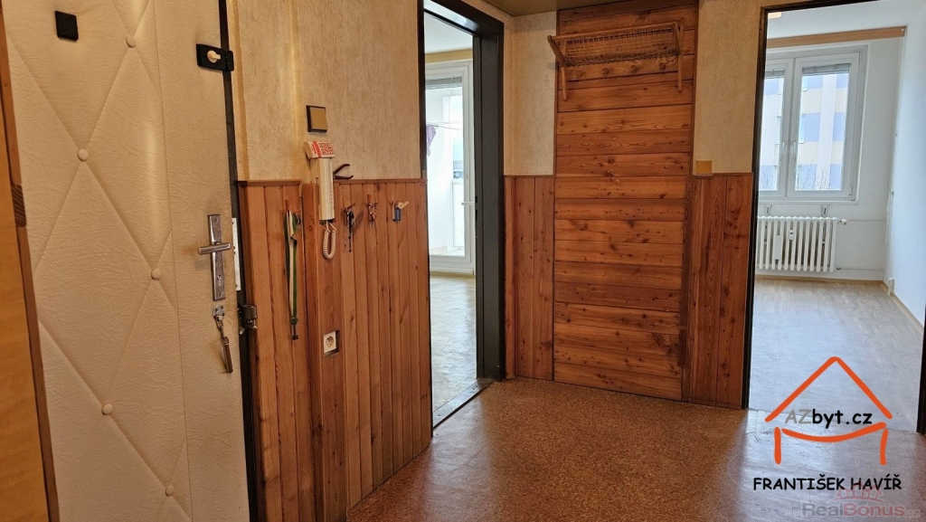 Dispozice bytu je praktická. Z předsíně se vchází do všech místností ? tří neprůchozích pokojů (19 + 13 + 11 m2), z nichž jeden má oddělený kuchyňský kout (7 m2), dále do koupelny s vanou a na samostatnou toaletu.