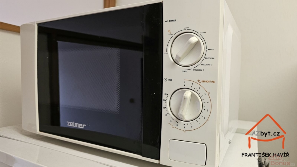 Kuchyňský kout se starší kuchyňskou linkou je vybaven elektrickým sporákem, menší volně stojící myčkou, lednicí s mrazákem, mikrovlnnou troubou a pračkou.