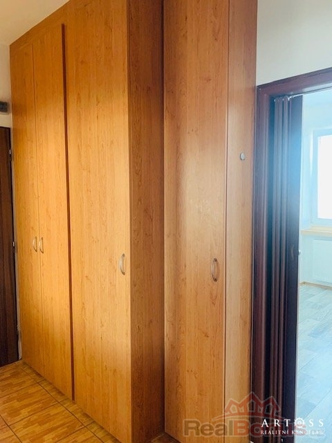 Co se týká bytu, pro nabízený pokoj je tam postel a policový díl, co je na fotce. V chodbě jsou vestavěné skříně, které jsou k dispozici pro nájemníka. Kuchyň je vybavená stolem a židlemi, myčkou, lednicí, dále varná konvice, vysavač, sušák na prádlo a základní vybavení s nádobím. V koupelně je nová pračka.