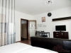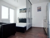 Dispozice bytu: vstupní předsíň s úložnou skříní, koupelna se sprchovým koutem, WC a pračkou, obytná místnost s kompletně vybavenou kuchyňskou linkou (elektrická trouba, sklokeramická varná deska, velká lednice s mrazákem, digestoř) a vstupem na prostorný balkón. Byt je pronajímán včetně veškerého nábytku a spotřebičů. Součástí je také velký zděný sklep umístěný na patře. K dispozici jsou bezpečnostní dveře, protipožární systém, žaluzie a možnost vysokorychlostního internetu.