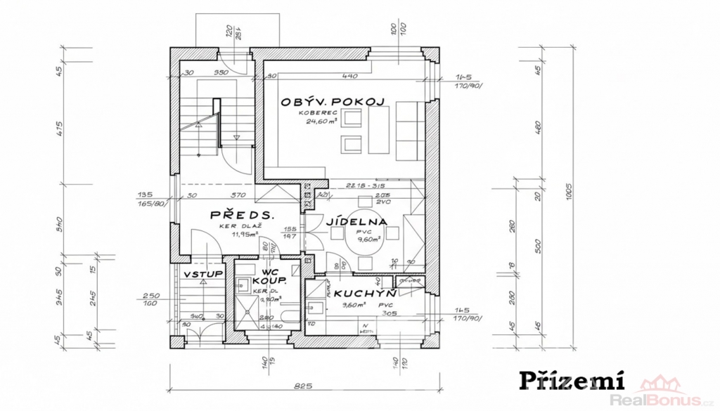 1. NP (přízemí) vstupní hala, obývací pokoj (24,6 m2) je propojen s jídelnou (9,6 m2), kuchyně (7,3 m2), koupelna s WC 4,9 m2, chodba 12 m2
