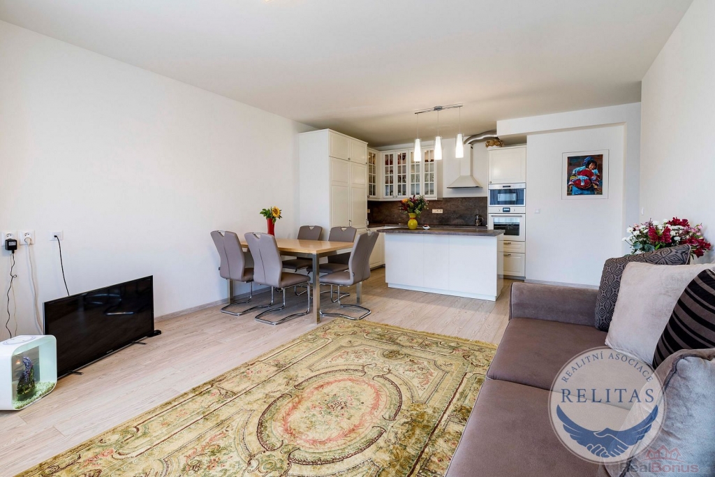 Nabízíme prostorný byt 4+kk, 116 m ve 4. nadzemním podlaží domu v rezidenční lokalitě. Dispozice bytu: velký obývací pokoj s kuchyňským koutem a navazující pokoj, oba se vstupem na prostornou terasu; na opačné straně bytu dvě komfortní ložnice (jedna s balkonem), dále velká koupelna s WC, samostatné WC pro hosty, prostorná komora, sklep v suterénu a pohodlné garážové parkovací stání v domě.