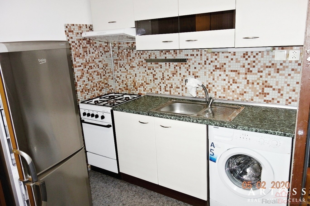 Obytný pokoj s balkonem je nevybavený. Kuchyně je zařízena linkou s plynovým sporákem, pračkou, lednicí, stolem a židlemi. Dále je zde potravinová skříň.
