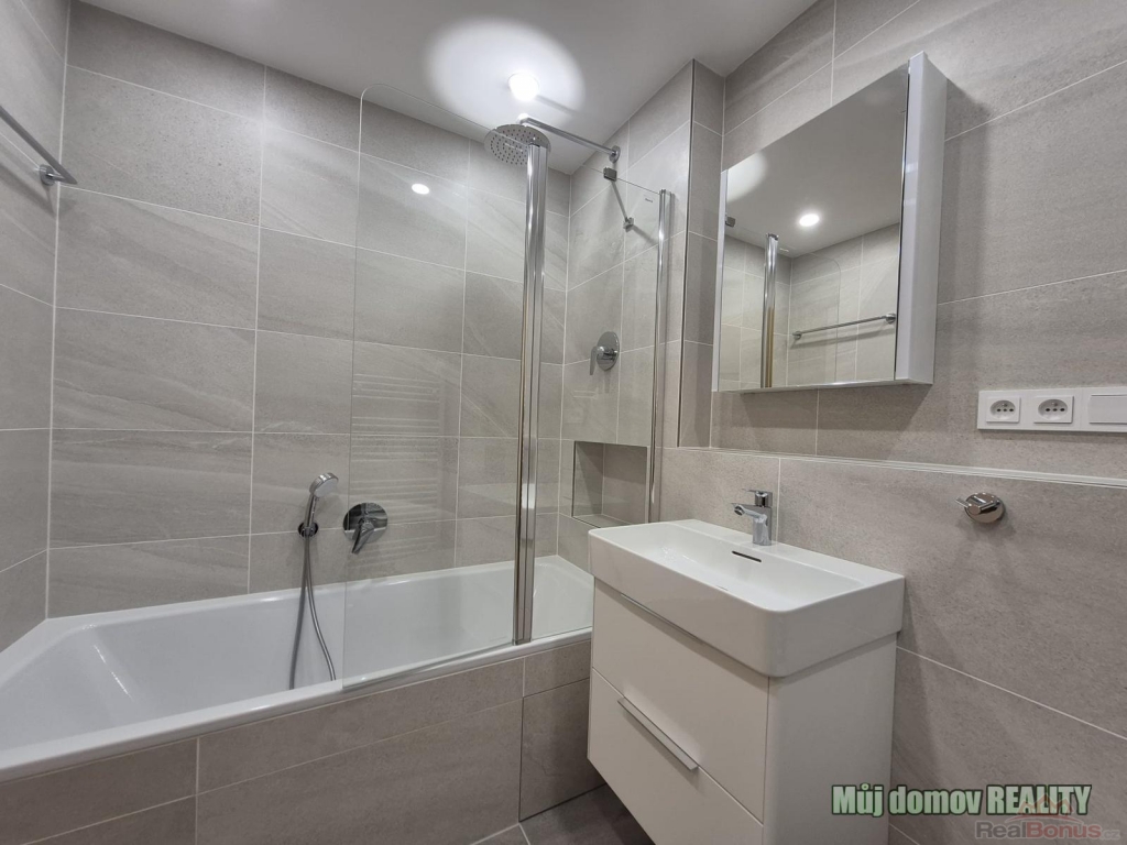 - Moderní koupelna s vanou, zrcadlovou galerií, skříňkou pod umyvadlem, háčky, držáky a toaletní sprchou GEBERIT,