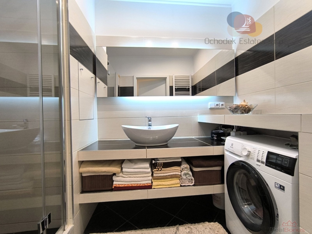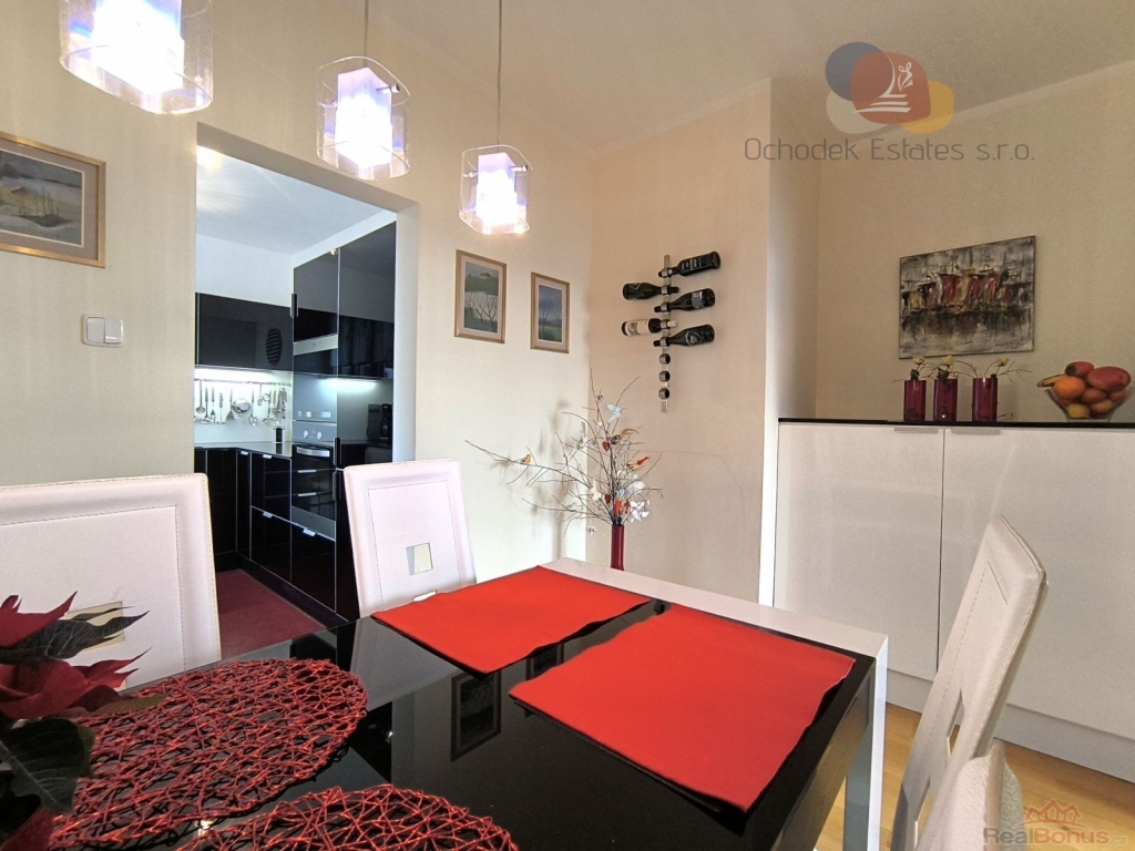 Kompletní rekonstrukce bytu tu proběhla v roce 2012 ale vše je tak pečlivě udržované a nadčasově navržené, že tu roky užívání nejsou prakticky znát. Dřevěné podlahy bez škrábanců, bezchybné podlahové vytápění v chodbě i koupelně, kuchyň ve vysokém lesku, chytré nastavitelné osvětlení.