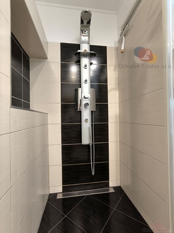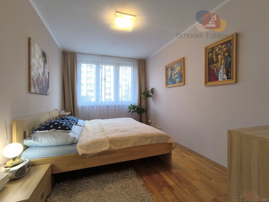 Dále jsou tu dvě samostatné neprůchozí ložnice, kde jedna z nich má i zasklenou lodžii. WC je samostatně, koupelna je laděná do elegantní hnědobéžové.