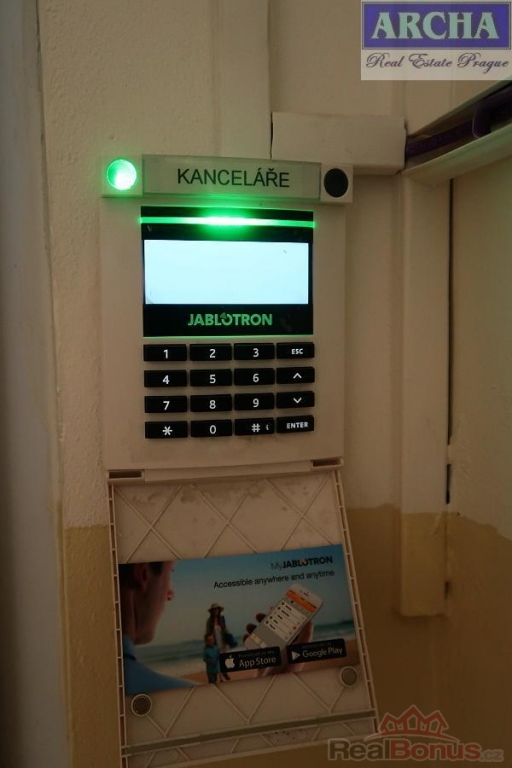 Kanceláře a zasedací místnost jsou na jednom patře, pod uzamčením, zabezpečení pohybovými čidly.