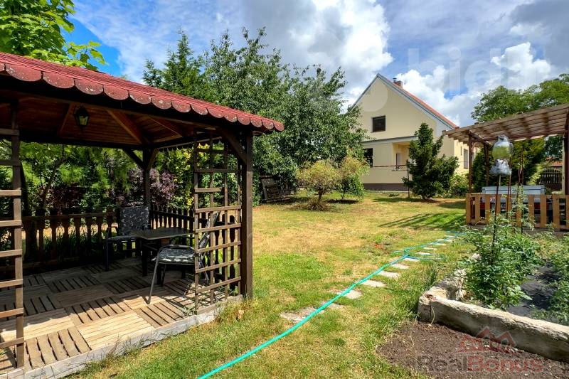Nachází se na pozemku o velikosti 775 m² a součástí domu je také samostatná garáž/dílna, které potěší každého kutila nebo kohokoliv, kdo ocení praktický úložný prostor navíc. Za garáží se nachází místnost, kterou můžete využívat jako venkovní kuchyň (je zde voda a elektřina), za kuchyní je prostorný dřevník. Na zahradě, která má přední i boční vstup, jsou vzrostlé stromy a keře, které zajišťují naprosté soukromí a v létě příjemný stín, najdete zde i altán pro posezení s rodinou a přáteli. Na zahradě je systém na sběr dešťové vody, kterou můžete využít na zalévání.