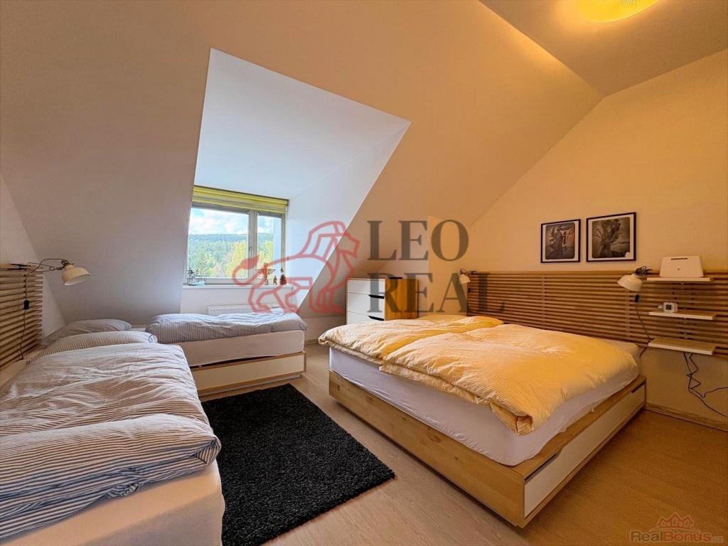 Předmětem prodeje je stylově zařízený mezonetový byt o dispozici 2+kk s velikostí podlahové plochy 77 m2. Bytový dům se nachází v klidně části Harrachova (Anenské Apartmány). Jedná se o strategické místo, které je nadosah centru Harrachova pouhých 15 minut pěšky, 3 minuty autem. Dispozice bytu je následující: po vstupu do bytu se ocitnete v přízemí bytu, kde se nachází plně zařízená koupelna se sprchovým koutem, umyvadlem a toaletou, dále pak prostor kk tedy kuchyně, jídelna, obývací pokoj a špajz. Následně po schodišti vystoupáte do 1. patra, kde je prostorná ložnice, galerie u schodiště je využita jako další prostor na spaní s rozkládací postelí, celkově lze v bytě ubytovat v obou patrech až 8 lidí. Byt je vytápěn dálkově a s provozem bytu jsou spojeny nízké měsíční náklady na provoz 6.000,- Kč/měsíc. Ze všech oken bytu je nádherný výhled do zeleně. Hned u domu se nachází dětské hřiště a první kopec s pomou, kde se učí lyžovat především děti. Tento byt je vhodný pro někoho, kdo hledá nenáročné bydlení na údržbu a miluje české hory. Nebo je možné byt koupit čistě s podnikatelským záměrem a pronajímat ho po celý rok s % ročním výnosem. Cesta z Prahy zabere většinou autem něco pod 2 hodiny klidnou jízdou. V Harrachově se nachází kompletní občanská vybavenost. Koupi nemovitosti je možné řešit hypotečním úvěrem, s kterým Vám rádi pomůžeme. pro více informací a prohlídky mě neváhejte kdykoliv kontaktovat.