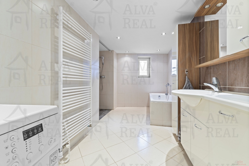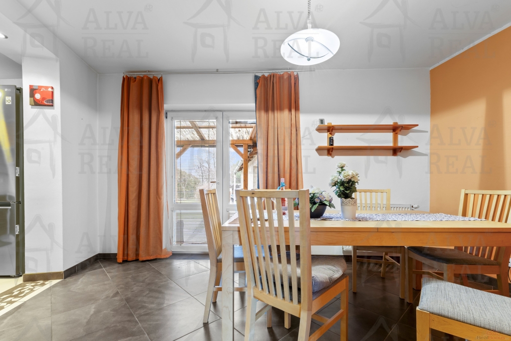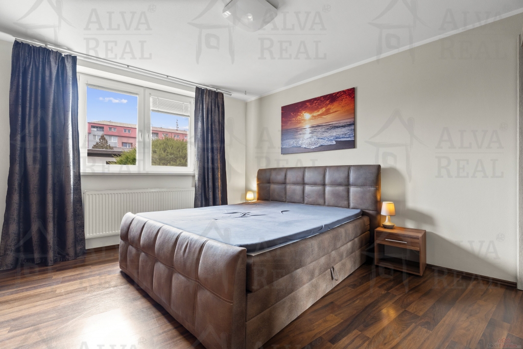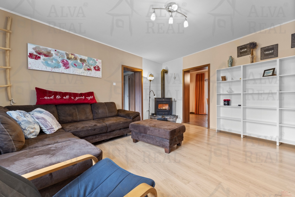 Vybavení: Kuchyňská linka včetně spotřebičů (el. trouba zn. Bosch, sklokeramická varná deska, digestoř Bosch, lednice LG), jídelna s dřevěným jídelním stolem a židlemi. V obývacím pokoji gauč s taburetem, obývací stěna. Ložnice vybavena manželskou postelí a šatní skříní. Prostorná koupelna s vanou i sprchovým koutem, koupelnový nábytek.