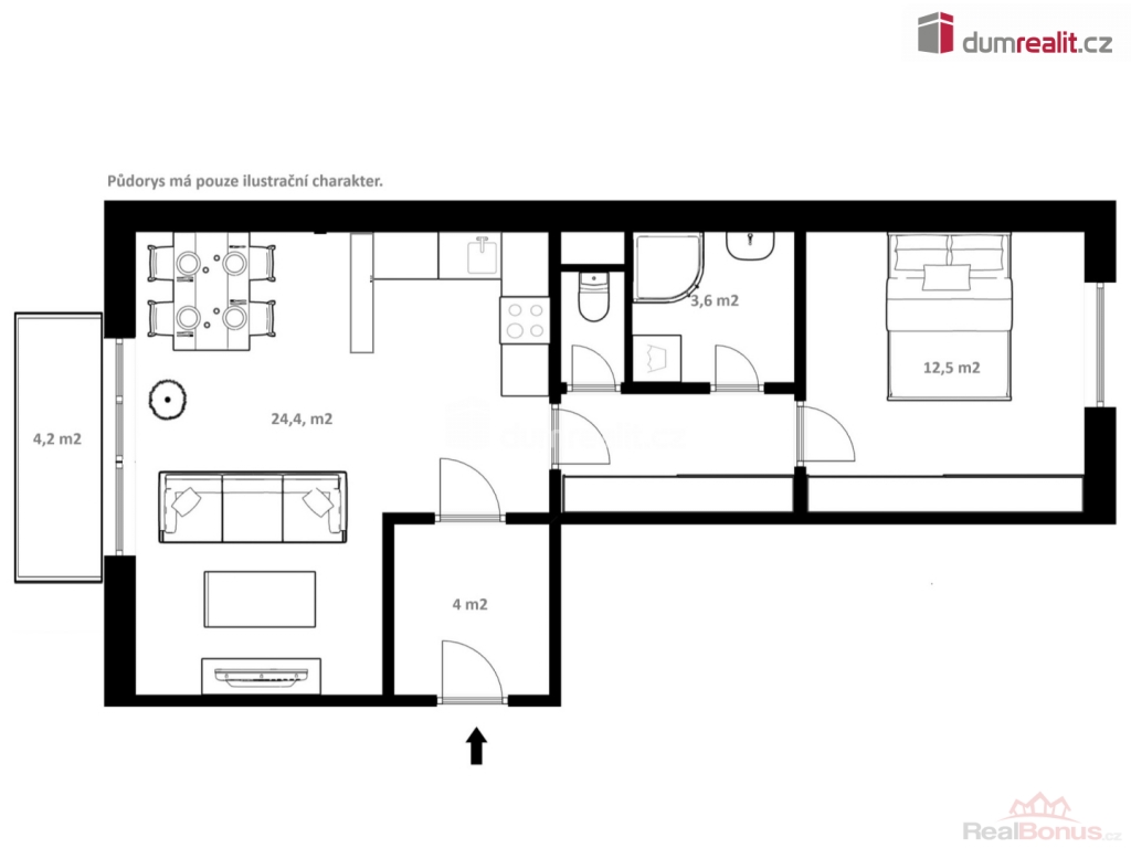 Nadstandardní byt prošel v nedávné době kompletní revitalizací a nabízí se k pronájmu bez vybavení/nábytku. Sestává ze zádveří, obýváku o 24,4 m s moderní kuchyňskou linkou s dostatkem prostoru pro jídelní stůl a s přístupem na balkon o cca 4,2 m, úplně nové koupelny se sprchovým koutem, umyvadlem s místem pro pračku, chodby s vestavěnou skříní a ložnice o o cca 12,5 m.