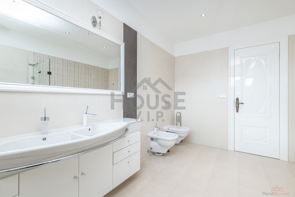 Dále se v patře nacházejí 2 velké zařízené ložnice, každá s vlastní koupelnou, a dobře vybavená pracovna s archivem, technické místnosti - žehlírna s úložnou skříní.
