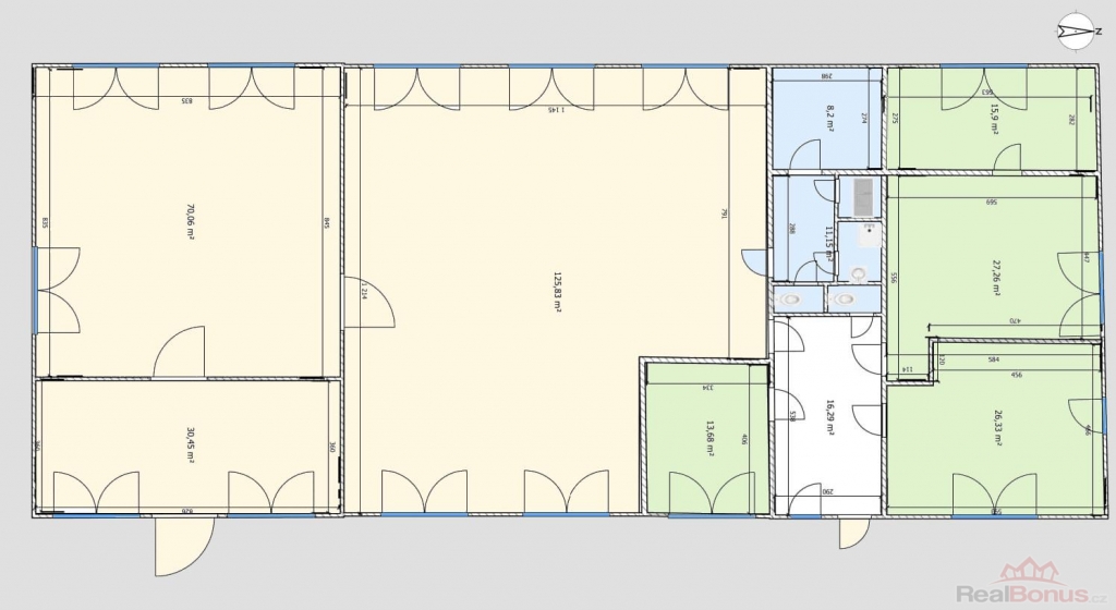 Objekt je dělen na výrobní a skladové prostory ( cca 2/3 ) Kanceláře a zázemí, vč. archivu. Prostory plně využívané, zkolaudované, vytápěné a moderní. 1x vstup do výrobní části, a 1x vstup do administrativní části. Původní využití - výroba a sklad. Příjezd veškeré nákladní a balíkové dopravy do 12,5t. Vstupy v úrovni venkovní komunikace. Zářivkové osvětlení, vícenásobné WC a koupelna, 4x kancelář - viz plánek.
