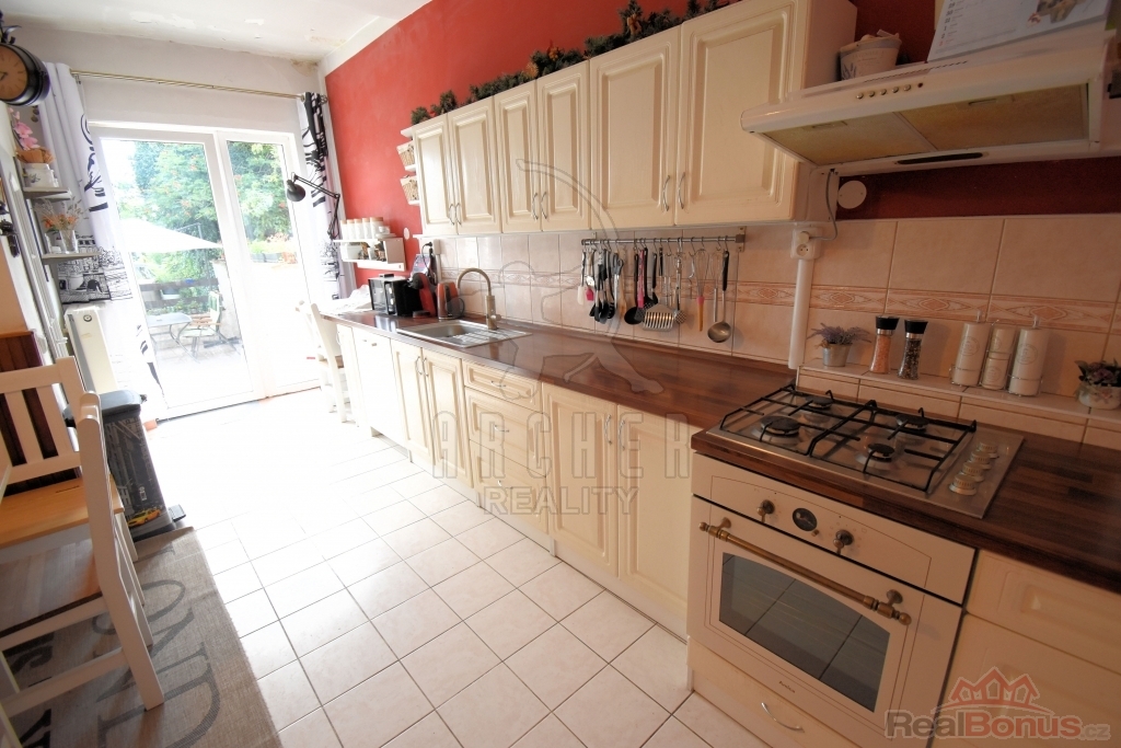 Prodej domu včetně kuchyňské linky se spotřebiči (plynová varná deska, digestoř, el.trouba, myčka) a vestavných skříní.