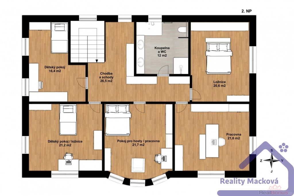 V patře má každý své soukromí. Dvě dětské ložnice, rodičovská ložnice se šatnou, pracovna a další multifunkční pokoj, který se snadno přizpůsobí vašemu životnímu stylu ať už jako druhá kancelář, pokoj pro hosty nebo klidná ložnice. Prostorná rodinná koupelna s vanou pro dva, sprchovým koutem a dvěma umyvadly je dostupná ze společné chodby.