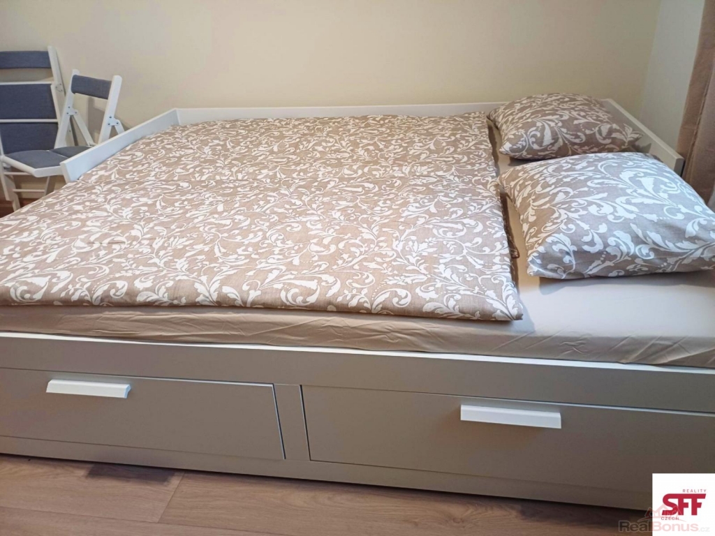 Byt je plně vybaven: Kuchyňská linka se spotřebiči (myčka, mikrovlnná trouba, varná deska, digestoř), jídelní stůl a židle, pracovní stůl a židle, rozkládací postel + 2 matrace (šířka po rozložení 160 cm x 200 cm), komoda a úložné prostory pro oblečení, botník, základní nádobí, lůžkoviny a povlečení a další drobné vybavení.