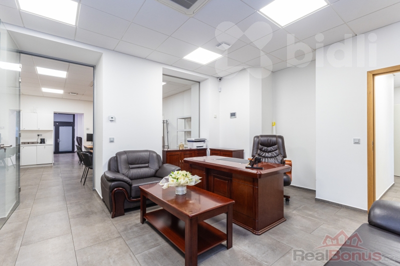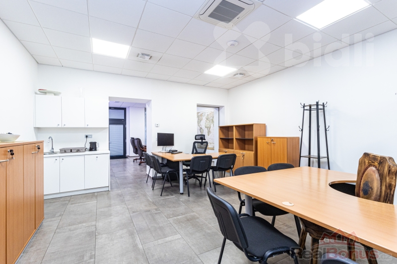 Prostor o výměře 94 m2 je řešen jako tři na sebe navazující (průchozí) kancelářské místnosti, což umožňuje plynulý provoz, variabilní uspořádání a efektivní využití plochy. Jednotka je vhodná pro kanceláře, showroom, klientské centrum nebo obchodní provoz. Přímý kontakt s ulicí prostřednictvím výlohy a příprava na podsvícené reklamní označení na fasádě zajišťují vysokou viditelnost a silný obchodní potenciál.