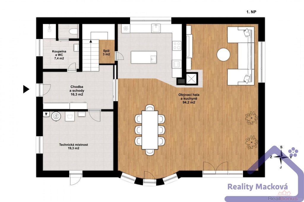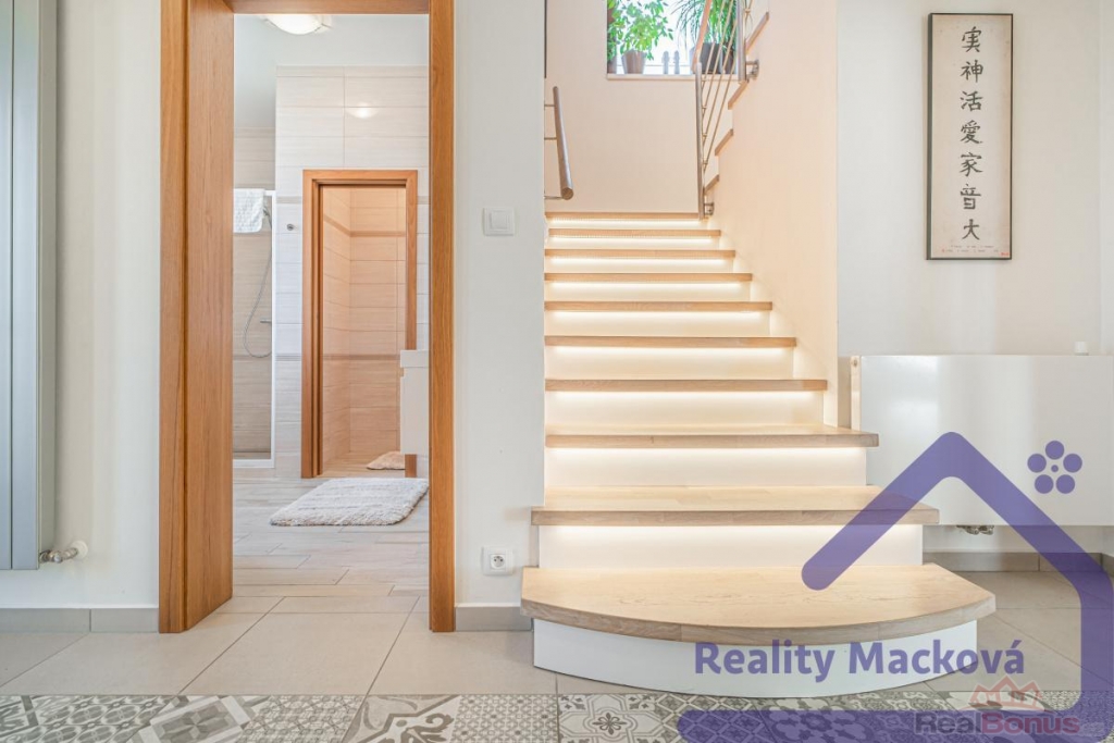 V přízemí se nachází světlý obývací pokoj s kuchyní a přímým vstupem na zahradu, kde se dá příjemně posedět u ranní kávy nebo večerního grilu. Velkou výhodou je technická místnost s vlastním vchodem do zahrady a množstvím úložných řešení, která udrží každodenní život v přehledném pořádku. Je tu i samostatná koupelna se sprchovým koutem a toaletou.
