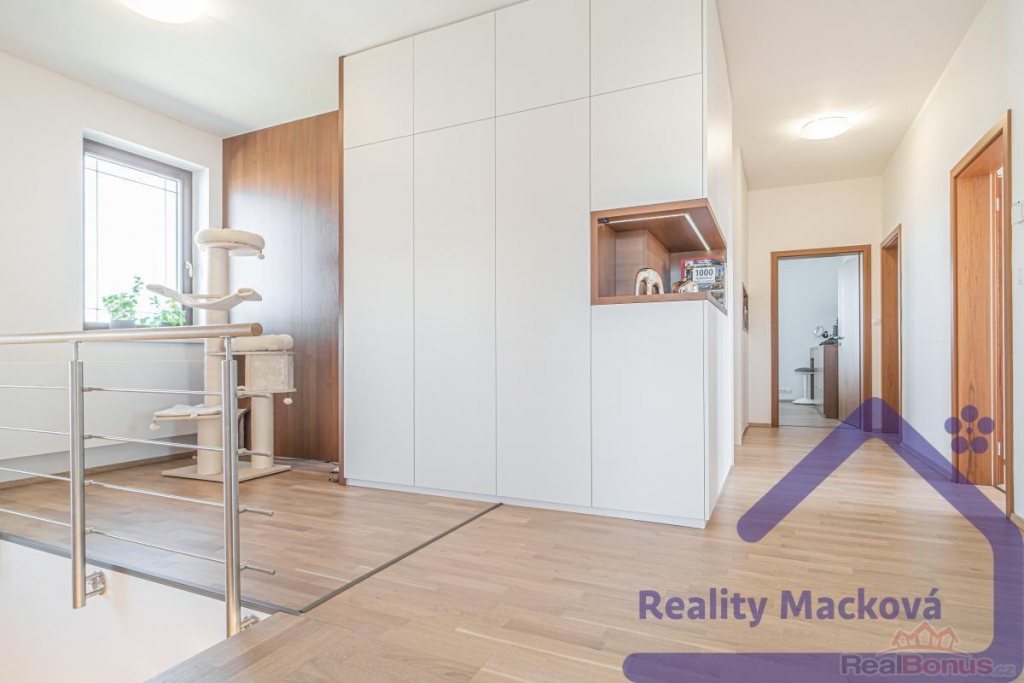 V patře se nachází dvě dětské ložnice, hlavní, rodičovská ložnice s vlastní šatnou, prostorná pracovna a ještě další pokoj, který může sloužit jako pokoj pro hosty, teenagery nebo domácí studio. Koupelna je prostorná a nabízí obrovskou vanu, sprchový kout i dvě umyvadla, což ocení zejména rodiny při ranním shonu.