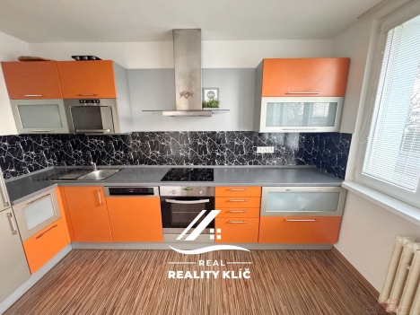 Dominantou bytu je prostorná kuchyně s moderní kuchyňskou linkou v kombinaci oranžových a šedých tónů, doplněná elegantní zástěnou v imitaci mramoru. Kuchyň je vybavena vestavěnými spotřebiči ? elektrickou troubou, mikrovlnou troubou, varnou deskou, digestoří a myčkou na nádobí. Velké okno zajišťuje dostatek denního světla a příjemný výhled.