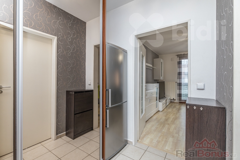 Na chodbě se nachází vestavěná skříň s lednicí, samostatná koupelna spolu s WC a pračkou.