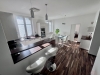 Dominantou bytu je moderní kuchyňská linka vybavená vestavěnými spotřebiči - lednicí, myčkou, troubou, mikrovlnnou troubou a varnou deskou.