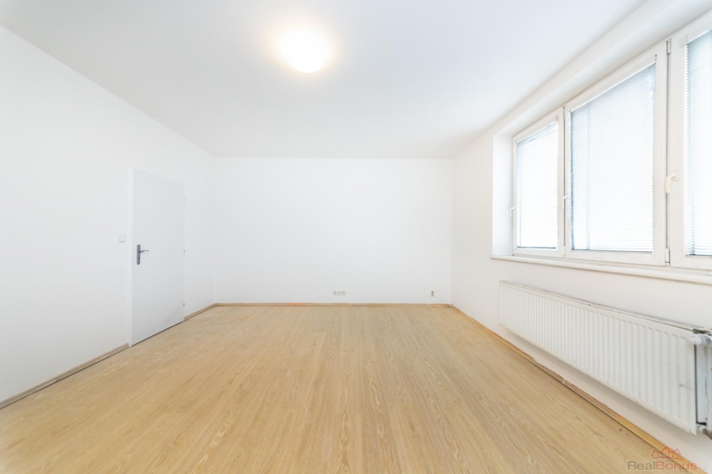 Srdcem bytu je prostorná a světlá obytná místnost s moderním kuchyňským koutem, která přirozeně propojuje prostor pro vaření, stolování i odpočinek. Z ní je přístup do druhého pokoje, který lze využít jako ložnici či pracovnu. Koupelna s toaletou působí čistě a funkčně.