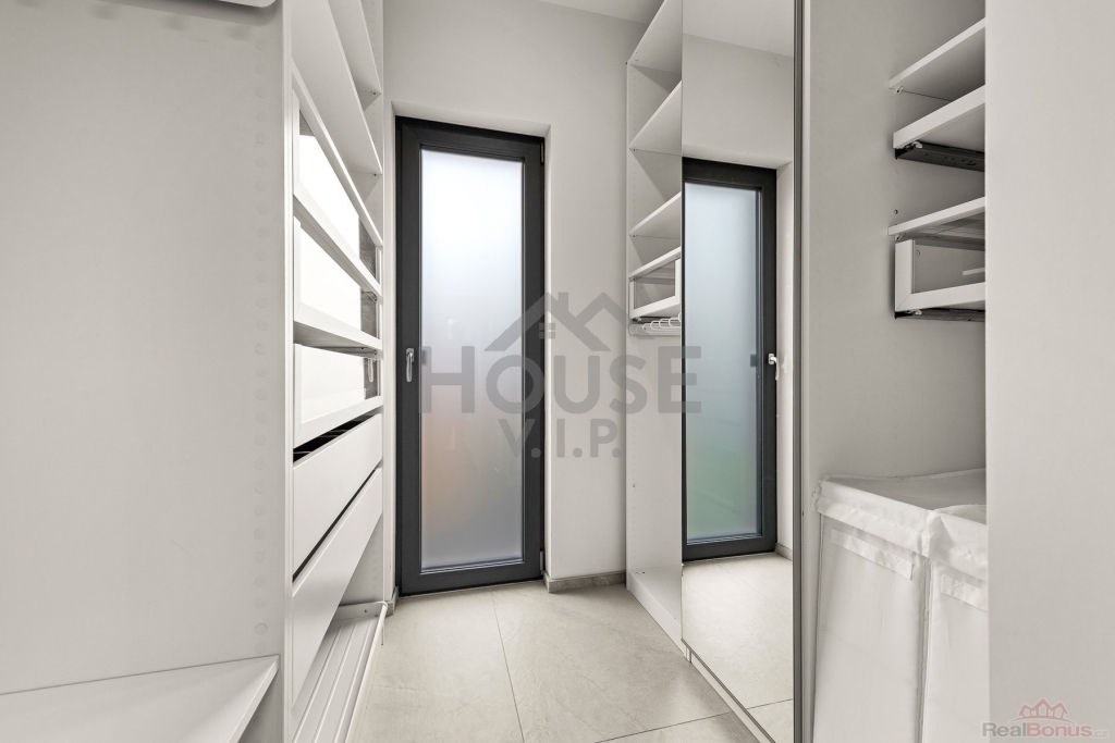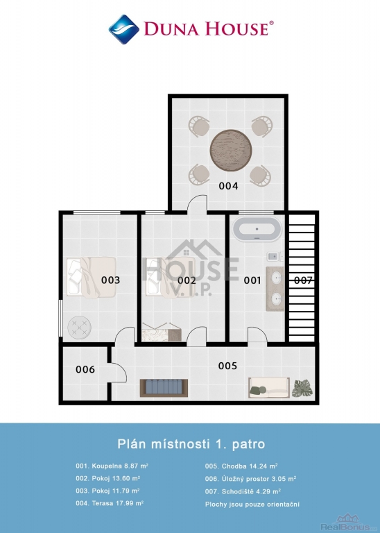 1. patro: dvě ložnice, velká koupelna, úložný prostor, terasa.
