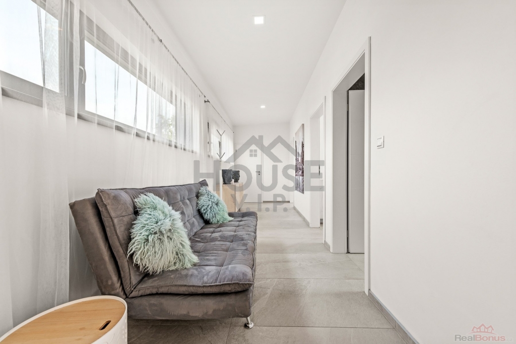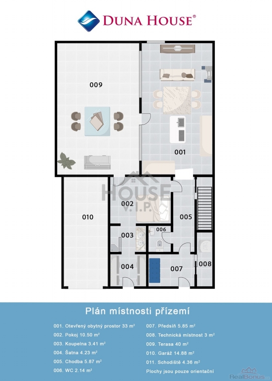 Přízemí: obývací prostor s kuchyní, pokoj, koupelna + WC, šatna, technická místnost, předsíň, garáž.