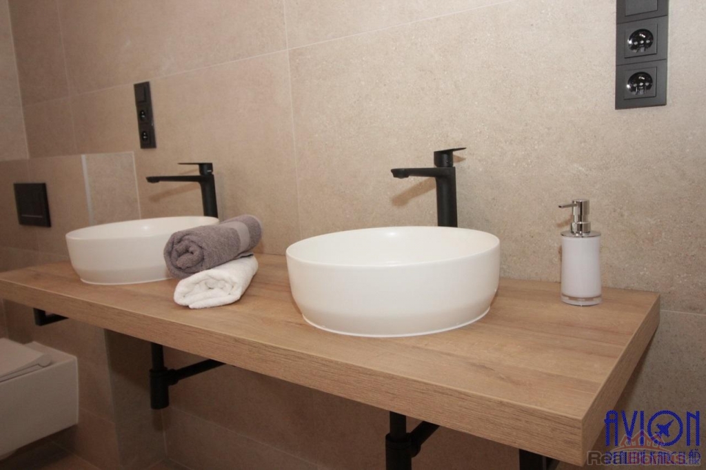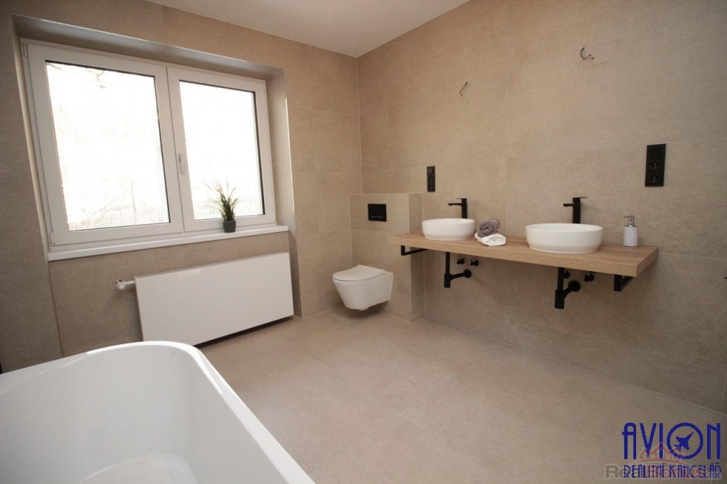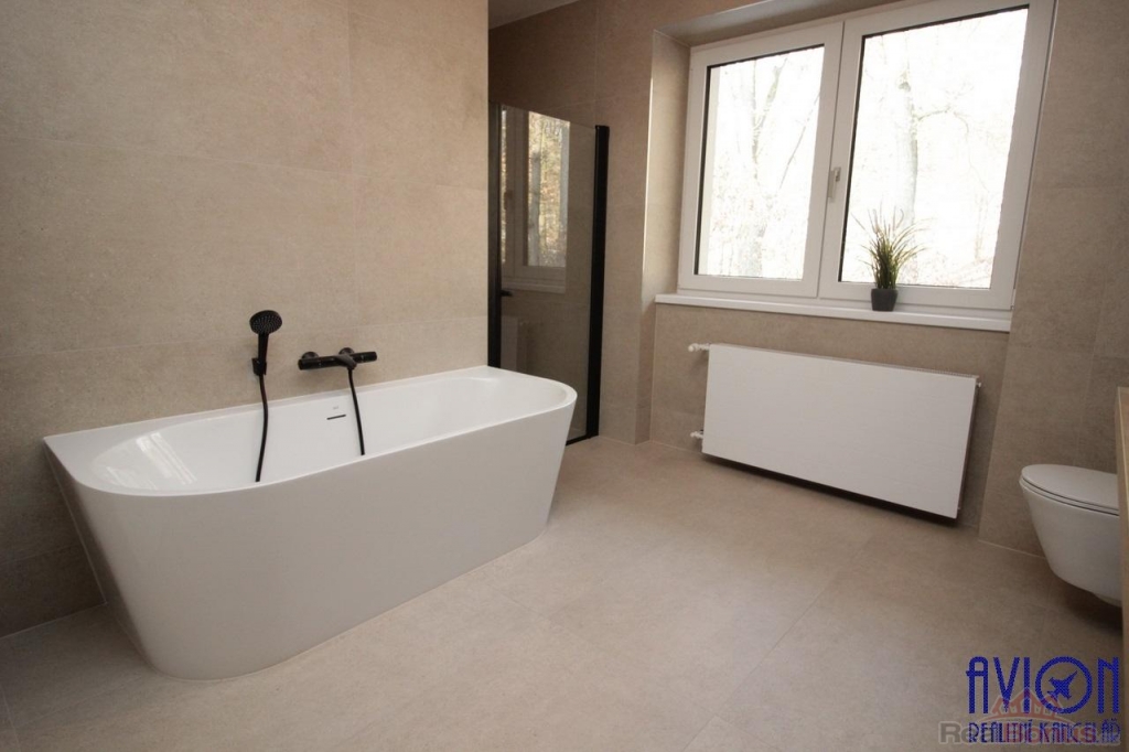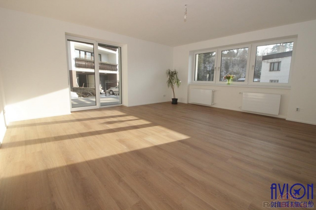 Ve všech pokojích bytu a na chodbách jsou vinylové podlahy, v koupelně a na toaletě je dlažba. Zakázkové interiérové bezfalcové dveře podtrhují moderní vzhled bytu. Nové rozvody elektřiny, vody a odpadů. Krásný slunný obývací pokoj 33 m2 se vstupem na terasu a dále na zahradu o výměře 100 m2 výlučně patřící k bytu. Oba další pokoje jsou slunné a prostorné (17 a 18 m2) s orientací oken na jihozápad a jihovýchod. Byt disponuje velkou koupelnou s oknem o výměře 11 m2, kde najdete vanu, sprchový kout, dvě designová umyvadla a WC, další WC je samostatné. Přímo v bytě je komora 2 m2.