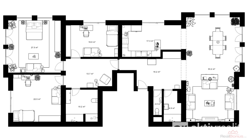 Byt je velmi světlý a pronájímá se vkusně a moderně zařízený. Místnosti jsou znázorněné v půdorysu a veškerý nábytek je vyrobený na míru. Nachází se zde obývací pokoj s jídelnou a kuchyňským koutem s veškerými spotřebiči Miele a Bosch. Dále jsou zde tři prostorné ložnice, chodba a hala s vestavěnou skříní, koupelna s vanou a toaletou, koupelna se sprchou, samostatná toaleta s umyvadlem.