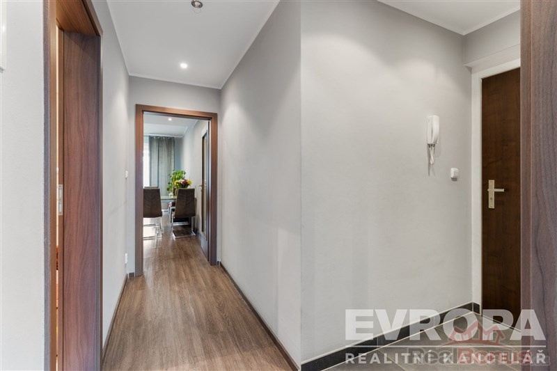 Byt je plně vybavený nábytkem i spotřebiči k dispozici je americká lednice, myčka nádobí, trouba, varná deska a úložné prostory v podobě vestavěných skříní na míru v předsíni i ložnici. Díky tomu je byt ihned připraven k pohodlnému bydlení bez dalších investic.