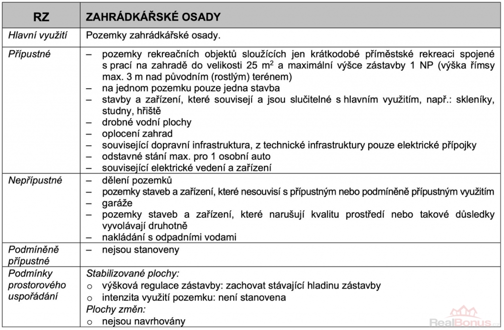 Dle platného územního plánu spadá do plochy RZ - zahrádkářské osady (viz. fotogalerie).