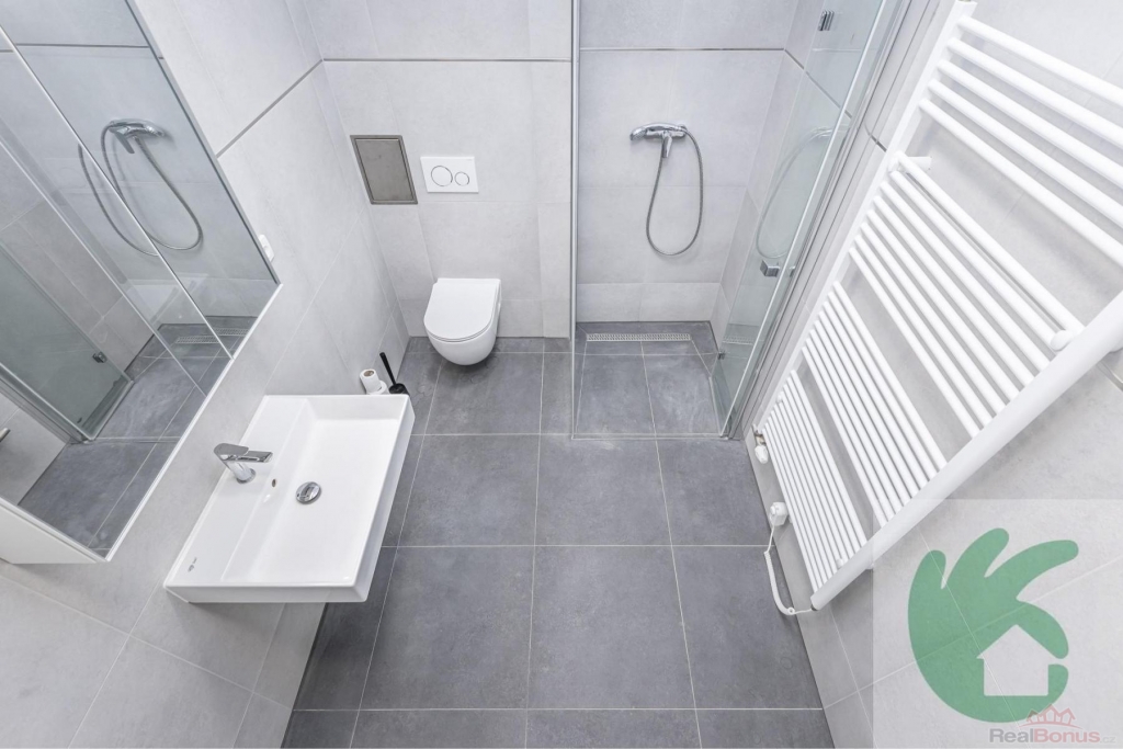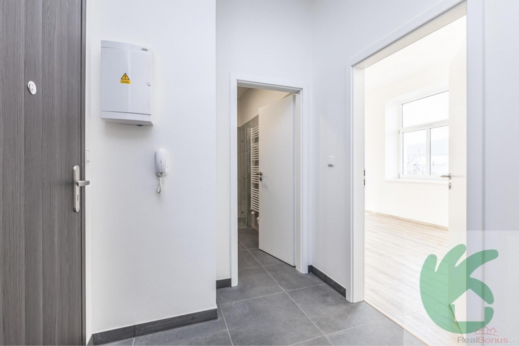 Byt je tvořen prostornou vstupní chodbou, kde se nachází skříň na uložení věcí. Dále z chodby vstoupíme do moderní koupelny, která disponuje prostorným sprchovým koutem umyvadlem a závěsnou skříňkou se zrcadlem a toaletou žebříkovým topením pro vyhřátí místnosti. Z chodby vstoupíme do pokoje, kde se nachází kuchyňská linka, která je vybavená s vestavnými spotřebiči (elektrickou troubou, varnou deskou, digestoří, mikrovlnou troubou). K bytu náleží komora, která je umístěna na stejném patře, jako byt. Rekuperace v celém bytě (řízené větrání s rekuperací tepla a čerstvým vzduchem do všech prostor, což zvyšuje komfort).