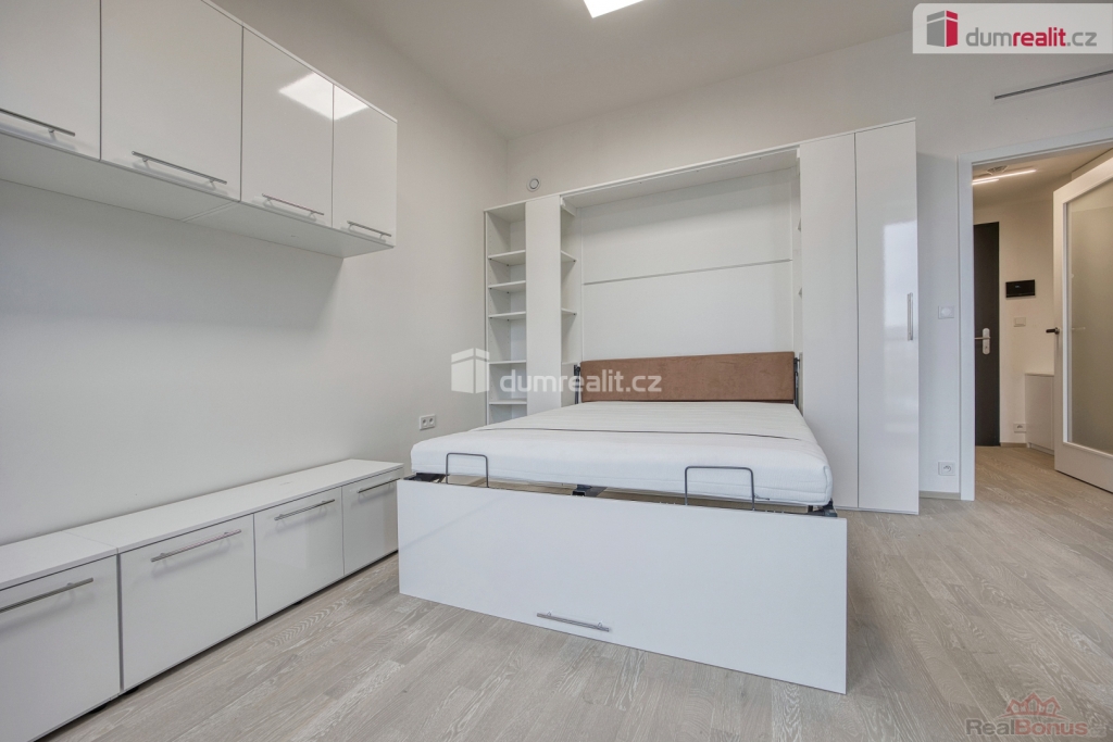 +popl. 3562, , Dumrealit.cz Vám zprostředkuje pronájem bytu o dispozici 1+kk, podlahové ploše 29m v novostavbě bytového domu rezidence Lihovar. Jedná se o novou rezidenční čtvrť na levém břehu Vltavy. Nabízí bydlení v unikátní atmosféře, která každý den ožívá kulturními i gurmánskými zážitky pod širým nebem, jen pár kroků od zeleně Císařské louky, Podolí nebo nedalekých Dívčích hradů. Interiér velmi světlého bytu tvoří obývací pokoj s plně vybavenou kuchyní (zcela nová kuchyňská linka se zabudovanou el.troubou Elektrolux, indukční varnou deskou, myčkou nádobí, lednicí, odpadkovým košem), proskleným přístupem na lodžii, koupelna se sprchovým koutem a toaletou, a vstupní chodba s vestavěnými skříněmi se zabudovanou pračkou. Obytná místnost je vybavena skříněmi s praktickou, výklopnou manželskou postelí. S užíváním jednotky je spojeno právo využití komory (sklepa) umístěného ve II.PP domu o velikosti 2,40m. Samozřejmostí je inteligentní ovládání domácnosti v aplikaci, bezpečnostní rolety, rekuperace, centrální podlahové vytápění, videotelefon, aktivní internetové připojení, kamerový systém a výtah. K dispozici nájemcům je také recepce, dále bistro umístěné u domu a uzavřené hrací hřiště. Uprostřed rezidence se nachází parkové sezení, komerční prostory a myčka kol. Na střeše domu je zelená zahrada s relaxačními zónami s výhledem na Vyšehrad.