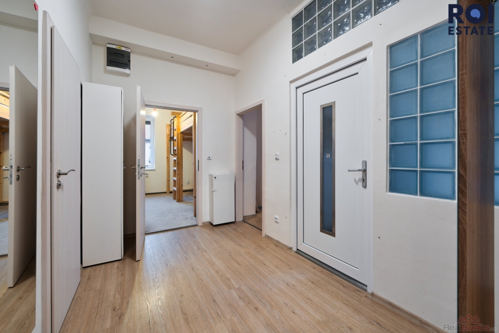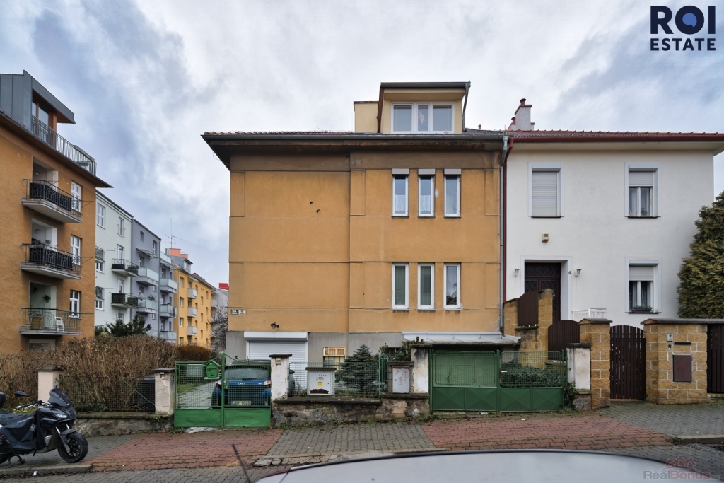 Nenápadný dům v klidné ulici, jen čtyři byty, zahrada a park za rohem. Uvnitř pak překvapivě prostorný byt 4+kk po rekonstrukci, který dává smysl dispozičně i atmosférou.