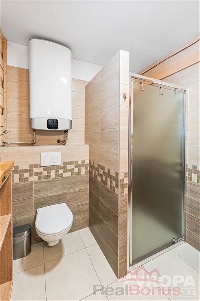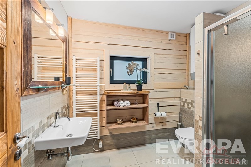 Interiér je dokonalým propojením dřeva, doplněné o stylová kachlová kamna a designovou dlažbu. Koupelny jsou vybavené vkusnou sanitou, podlahovým vytápěním a elektrickými žebříčky.