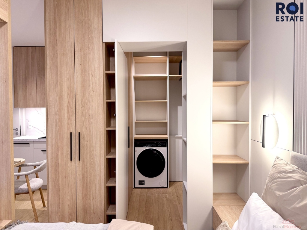 Neméně překvapivá je šatna , která je skryta za nenápadnými dveřmi vedle postele. A zde je i úkryt pro pračku se sušičkou!