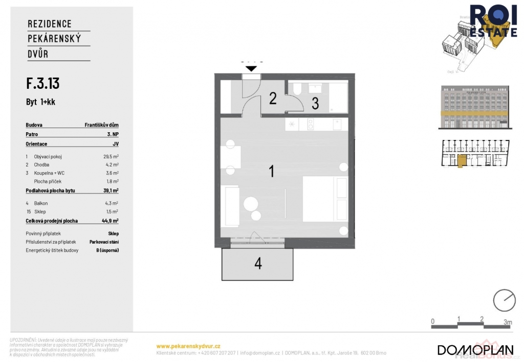 Byt má 39,6 m2, balkon 4,3m2 a sklep 1,5 m2.