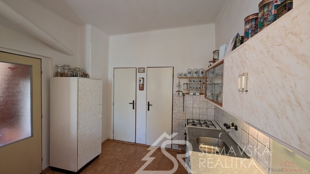 Vnitřní dispozice: Ze zápraží se vstupuje do předsíně, kde vlevo se nachází samostatné WC, ložnice, vstup na prostornou a zatím nevyužívanou půdu. Srdcem domu je kuchyně s kamny na tuhá paliva, komorou a nově vybudovanou koupelnou (cca před 18 lety). Z kuchyně je vstup do obývacího pokoje, který nabízí přímý vstup na terasu s kouzelným výhledem na šumavské kopce.