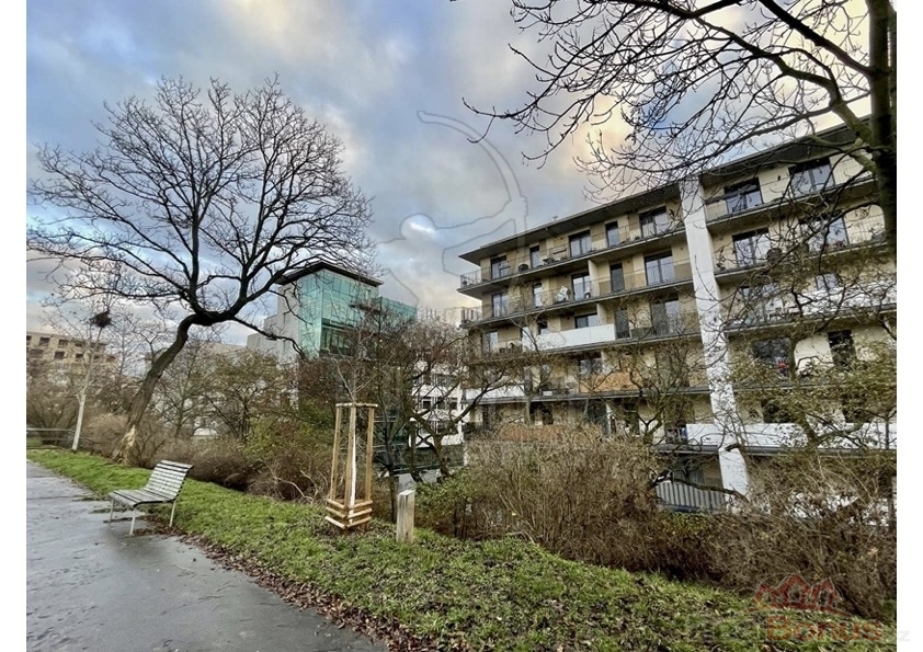 Ze společných prostor vstupujeme skrze bezpečností dveře do praktické chodby, která poskytuje dostatek místa pro úložné prostory. První místnost bytu slouží jako velkorysá obytná kuchyně ústící francouzskými dveřmi se vchodem na balkon. Podélná kuchyňská linka disponuje všemi moderními spotřebiči, designový jídelní set dodává prostoru lehkost a eleganci. Navazující místnost slouží jako ložnice a pracovna zároveň. I zde nalezneme vstup na obytný balkon s příjemným posezením a výhledem na park. V obou místnostech je kvalitní dřevěná podlaha. V samém srdci bytu se nachází ještě koupelna s nadstandardně velikým sprchovým koutem a toaletou. K bytu náleží parkovací stání v suterénu domu, které je součástí prodeje.