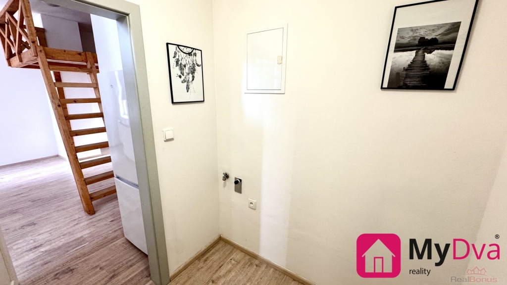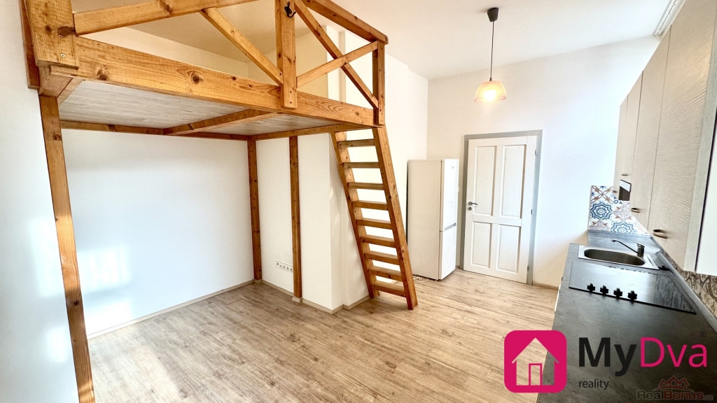 Nabízíme k pronájmu byt o dispozici 1+kk a o podlahové ploše 25 m2. Byt se nachází v 1.nadzemním podlaží cihlového domu. Stylový byt se skladá z předsíně, kuchyně spojené s obývacím pokojem a galerií na spaní, koupelny se sprchový koutem a toalety. K bytu náleží sklep.