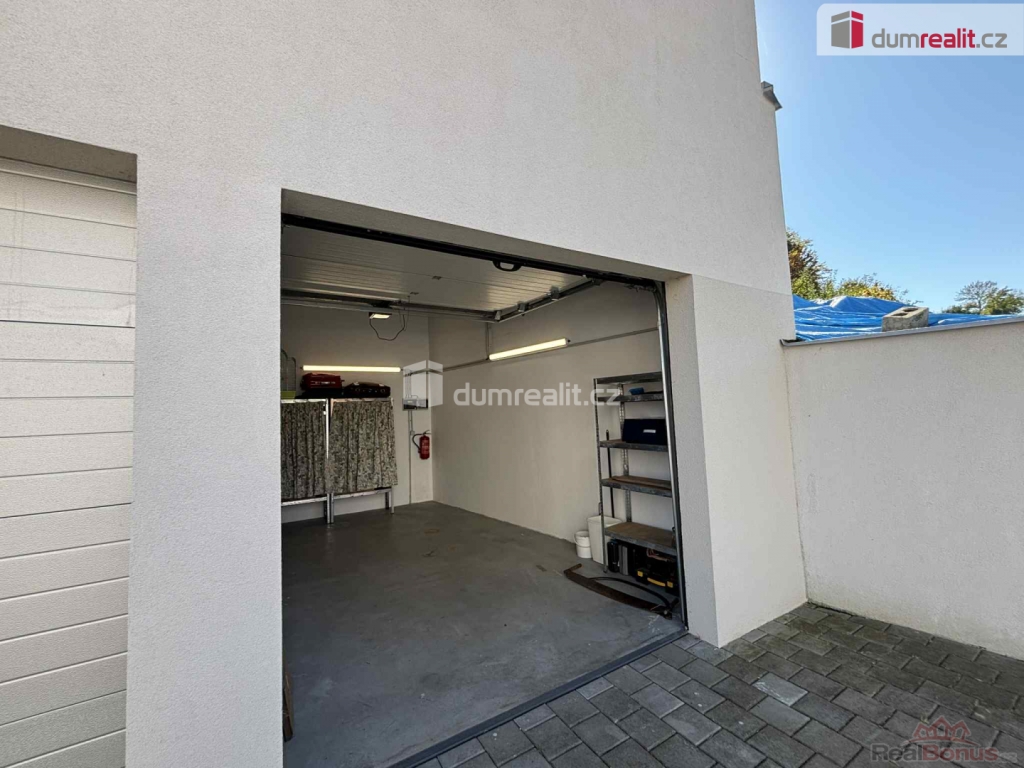V garáži je elektrická zásuvka a odpočtový elektroměr.