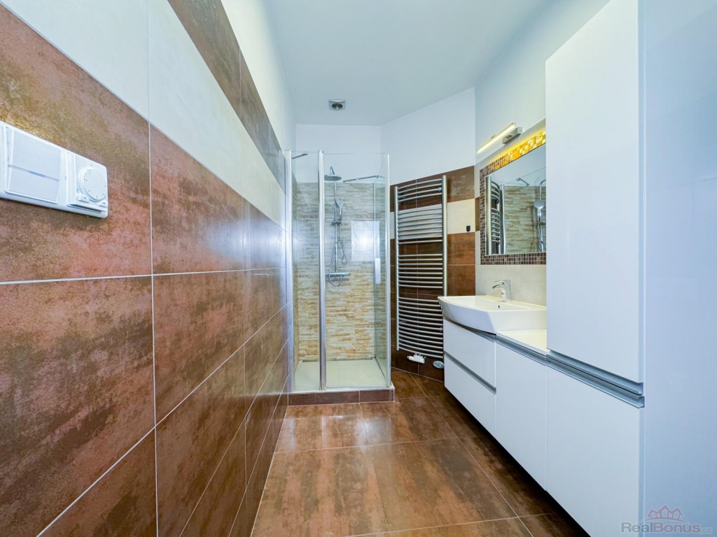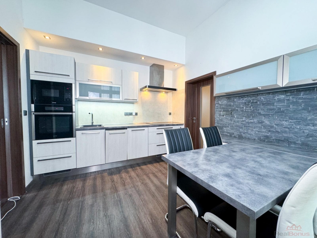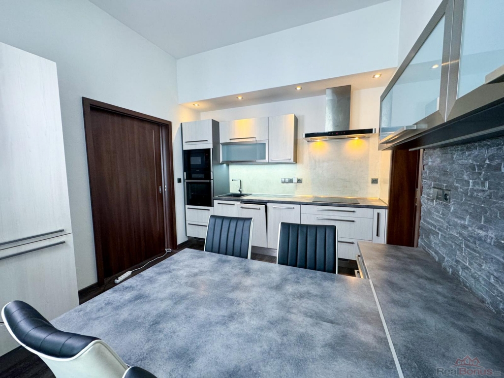 - Byt je nevybavený, součástí je však kuchyňská linka s vestavěnou varnou deskou, troubou, mikrovlnnou troubou, myčkou a lednicí s mrazákem.