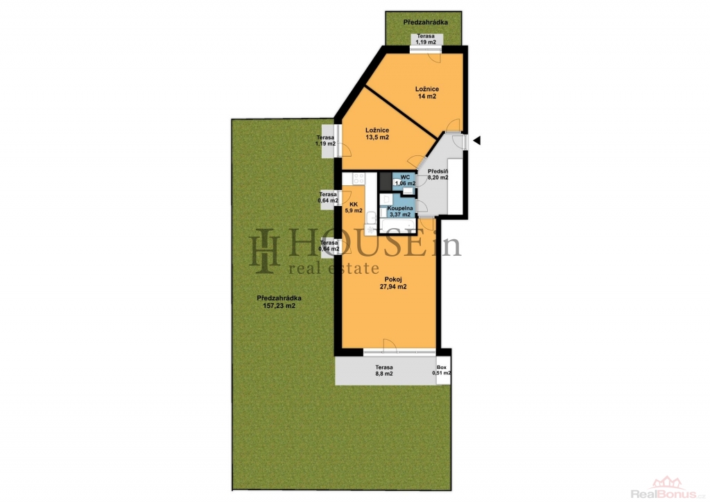 Některé použité fotografie pocházejí z totožného bytu se stejnou dispozicí o patro výše, který má místo teras a vstupů na předzahrádku balkóny.