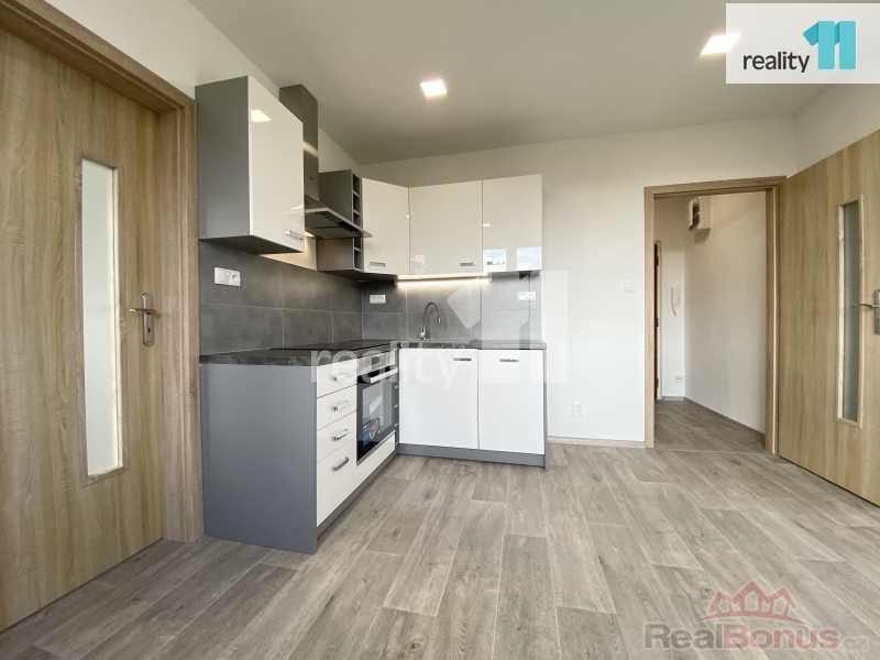 Dispozice a vybavení: vstupní chodba oddělena příčkou a dveřmi, kuchyň s obývacím pokojem, ložnice, zděná koupelna se sprchovým koutem, závěsná skřínka s umyvadlem, závěsné WC. Nová moderní kuchyňská linka do L vybavena vestavěným spotřebiči - vestavná trouba, komínový odsavač par, sklokeramická deska a myčka na nádobí. Příjemné prostředí v bytě vytvářejí snížené stropy s bodovými světly v kuchyni, koupelně a na chodbě.