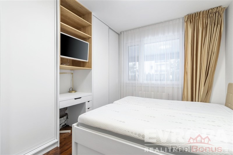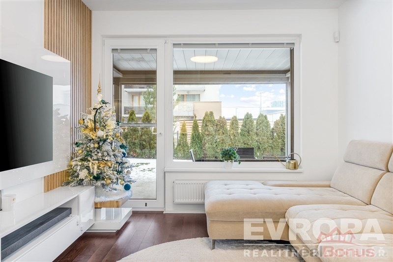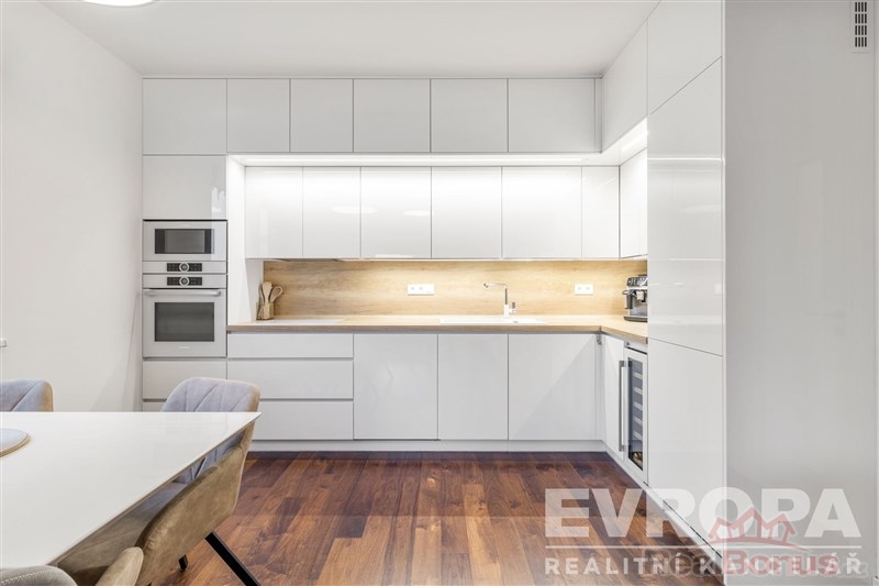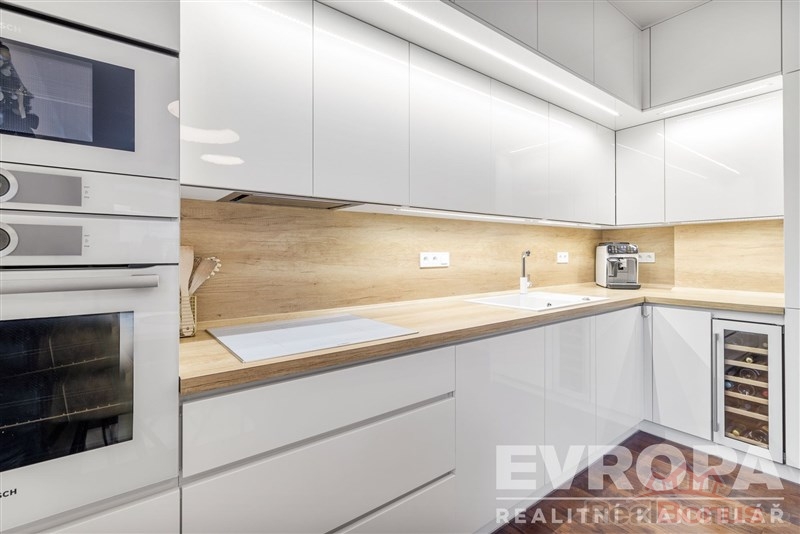 Interiér bytu byl kompletně realizován na míru s důrazem na kvalitu, funkčnost a nadčasový design. Nemovitost se prodává plně vybavená zakázkovým nábytkem, nový majitel tak může bydlet okamžitě bez jakýchkoliv dalších investic. Kuchyňská linka je osazena kvalitními spotřebiči značek BOSCH a SIEMENS, doplněna o vestavěnou vinotéku. Obývací část nabízí elegantní televizní stěnu s elektrickým krbem, který dotváří příjemnou atmosféru celého prostoru.