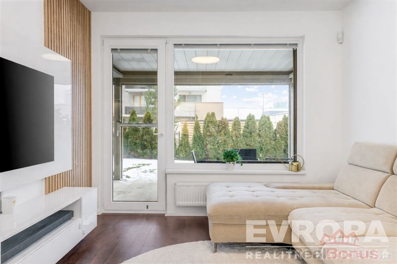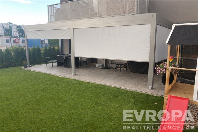 Jedním z hlavních lákadel této nemovitosti je unikátní venkovní prostor. K bytu náleží terasa o ploše 33 m s velkou bioklimatickou pergolou vybavenou screenovými roletami a LED osvětlením. Na ní navazující soukromá zahrada o velikosti 100 m. Zahrada je automaticky zavlažována, osázena tújemi a udržována robotickou sekačkou. Součástí zahrady zůstává také prostorná úložná bedna a dětský zahradní domek.