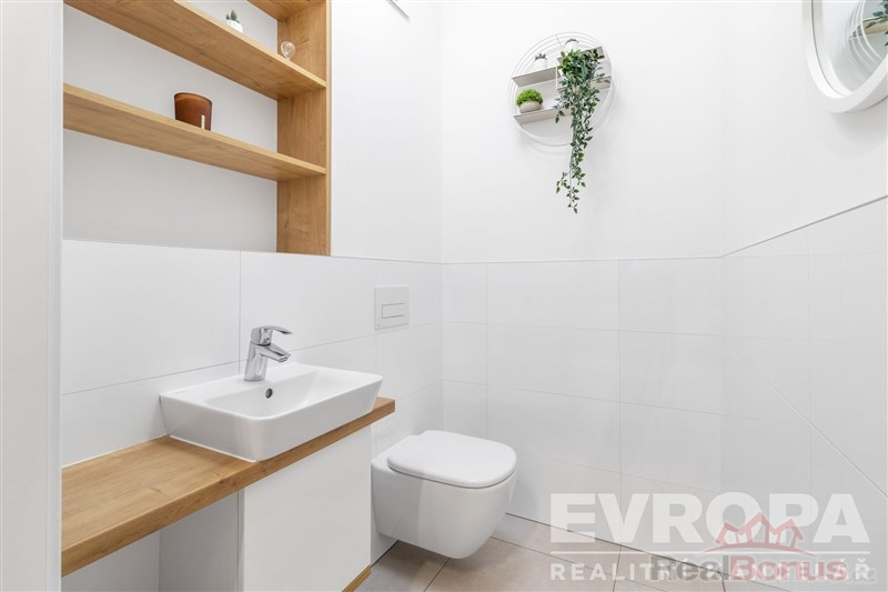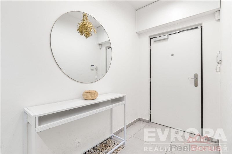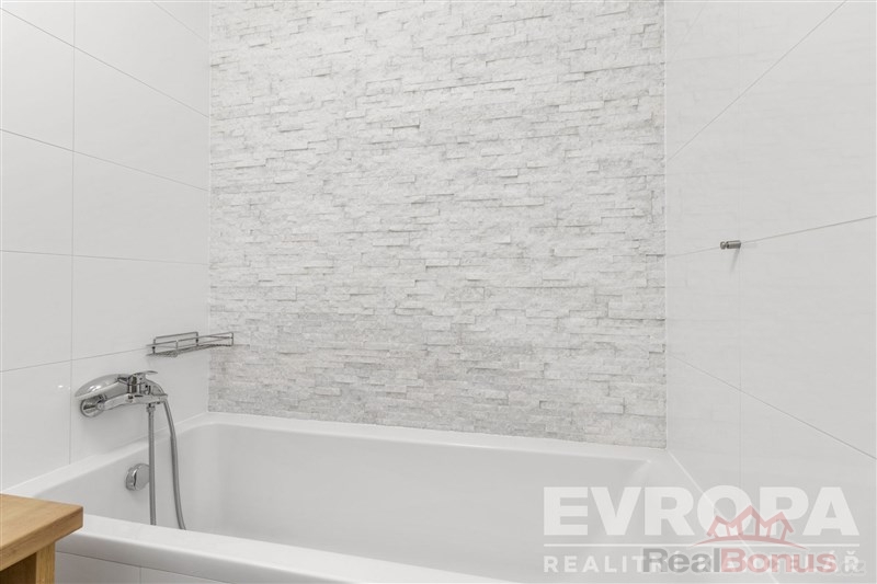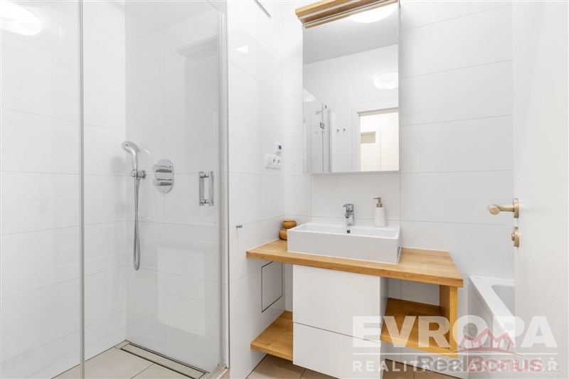 V celém bytě byly použity dřevěné podlahy, kvalitní obklady a dlažby, vše v nadstandardu oproti původnímu provedení od developera. Samozřejmostí jsou velkorysé vestavné skříně s promyšlenými úložnými systémy, včetně výsuvného botníku. Praktickým benefitem je samostatná komora s pračkou a sušičkou AEG z nejvyšší produktové řady. Koupelna byla kompletně upravena tak, aby nabízela jak vanu, tak sprchový kout a je doplněna podlahovým topením pro maximální komfort.