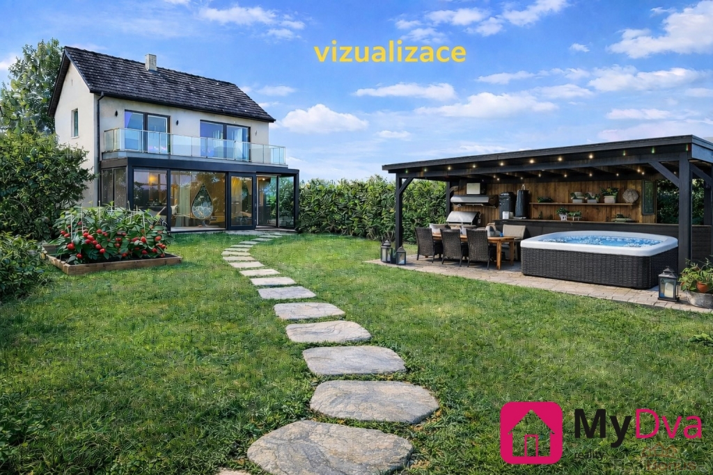 Mezi fotografiemi jsou také vizualizace (ilustrační návrhy), které názorně ukazují možné využití navazující stavební parcely. Přibližují například možnost výstavby dalšího domu (i dvoupodlažního, se zimní zahradou či balkonem) a doplnění zázemí jako pergola, zahradní kuchyň, relaxační zóna, parkování/přístřešek pro auto i napojení příjezdové cesty od hlavní silnice. Vizualizace mají inspirativní charakter.